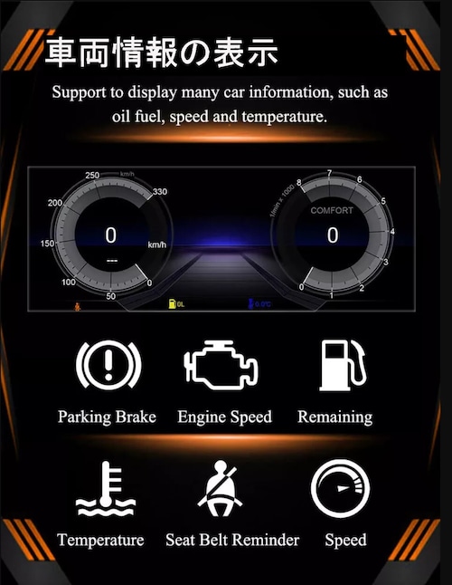 スピードメーターやサイドブレーキ、シートベルト、ドア情報など様々な車両にかかわる情報の表示機能あり
